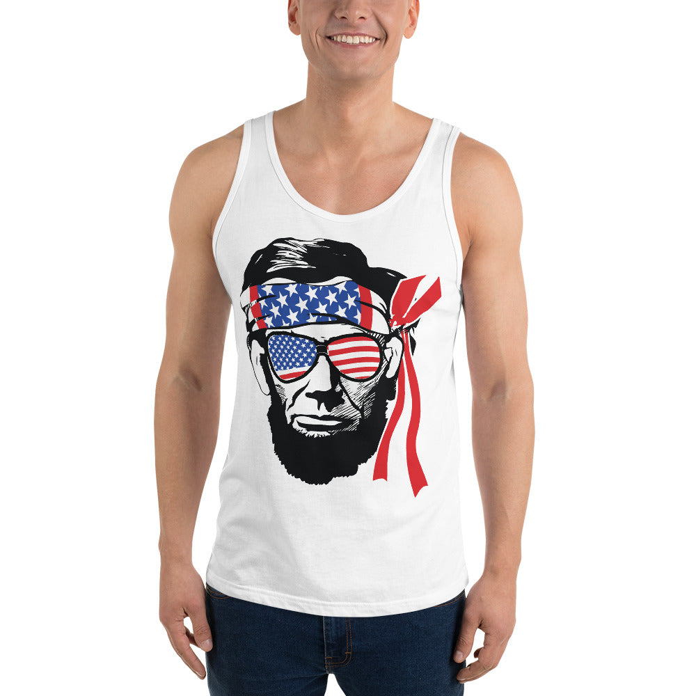 This tank top embodies American history with a twist of coolness! Featuring the head of Abraham Lincoln donning a patriotic headband and smoked sunglasses, it's as if Honest Abe decided to rewrite the rules of presidential style. Wear it and add a dose of presidential humor to your wardrobe because even great statesmen can have a quirky sense of fashion!