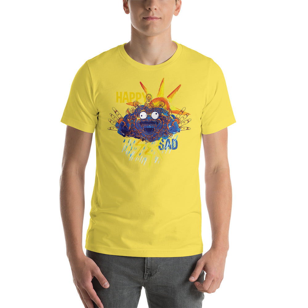 Imagine this shirt with a cloud transitioning from a cheerful mood wearing sunglasses to a sulking demeanor throwing lightning bolts. It's as if the weather decided to attend a yoga session for its emotional well-being! Wear this shirt and let the world know that you understand that sometimes, even clouds have their cloudy days.